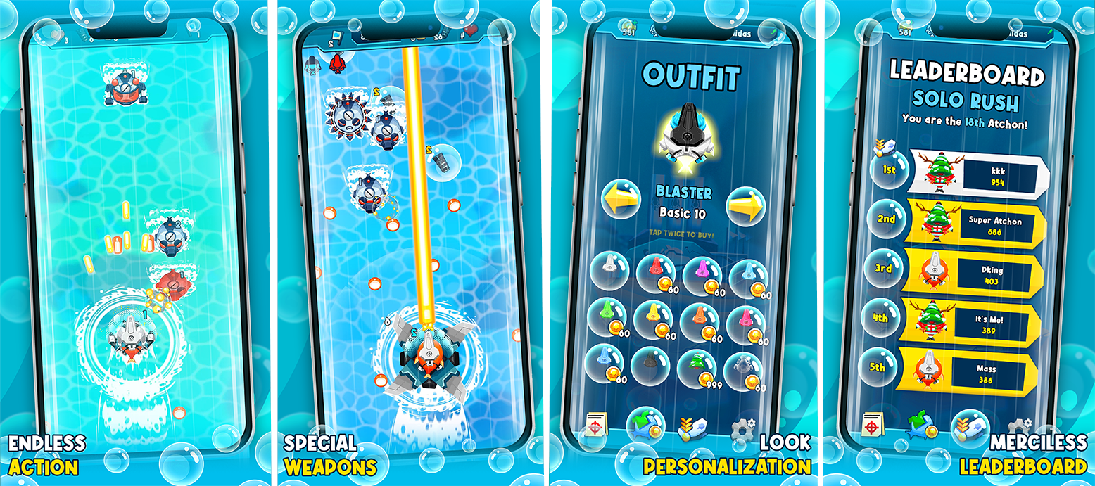 Atchon Squad is the very first mobile arcade "sea" shooter of its kind having you protect the sea against the evil fishbots invasion! Customize your Atchon soldier and dive in a stylized marine world war, master authentic reflex based gameplay mechanics mixing both distance and melee combat moves to defeat merciless enemies and bosses, unlock special events and upgrades according to your performance, dominate the global leaderboard or challenge worldwide players in an exciting real-time PVP game mode!