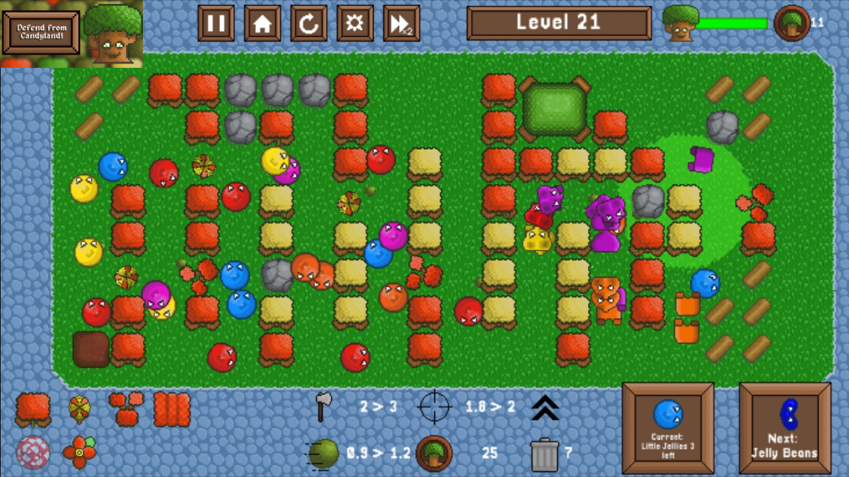 "The trees are under attack from the evil candy, you need to Defend from Candyland! Build up a plant based defence to protect the trees from both land and air. Try to overwhelm them by planting the whole field with your defences, or prioritize a few choice plants and level them up, the choice is yours!"