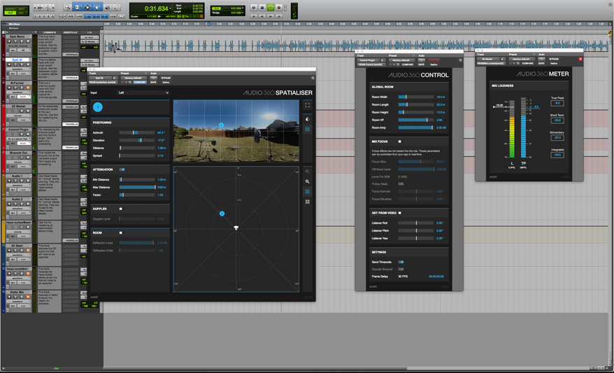 In Pro Tools, for example, this can be done with the use of FB360, which has several plugins that automate the output to binaural audio. The user has to import the respective sound files and start to spatialize the points according to the action that takes place in the video. The plugin allows to track the movements in real-time and automates the output, so it is extremely handy in that manner. The FB360 offers a high level of automation of the parameters, although in complex audio processing and spatialization projects also more adjustment is needed to create a natural sounding
