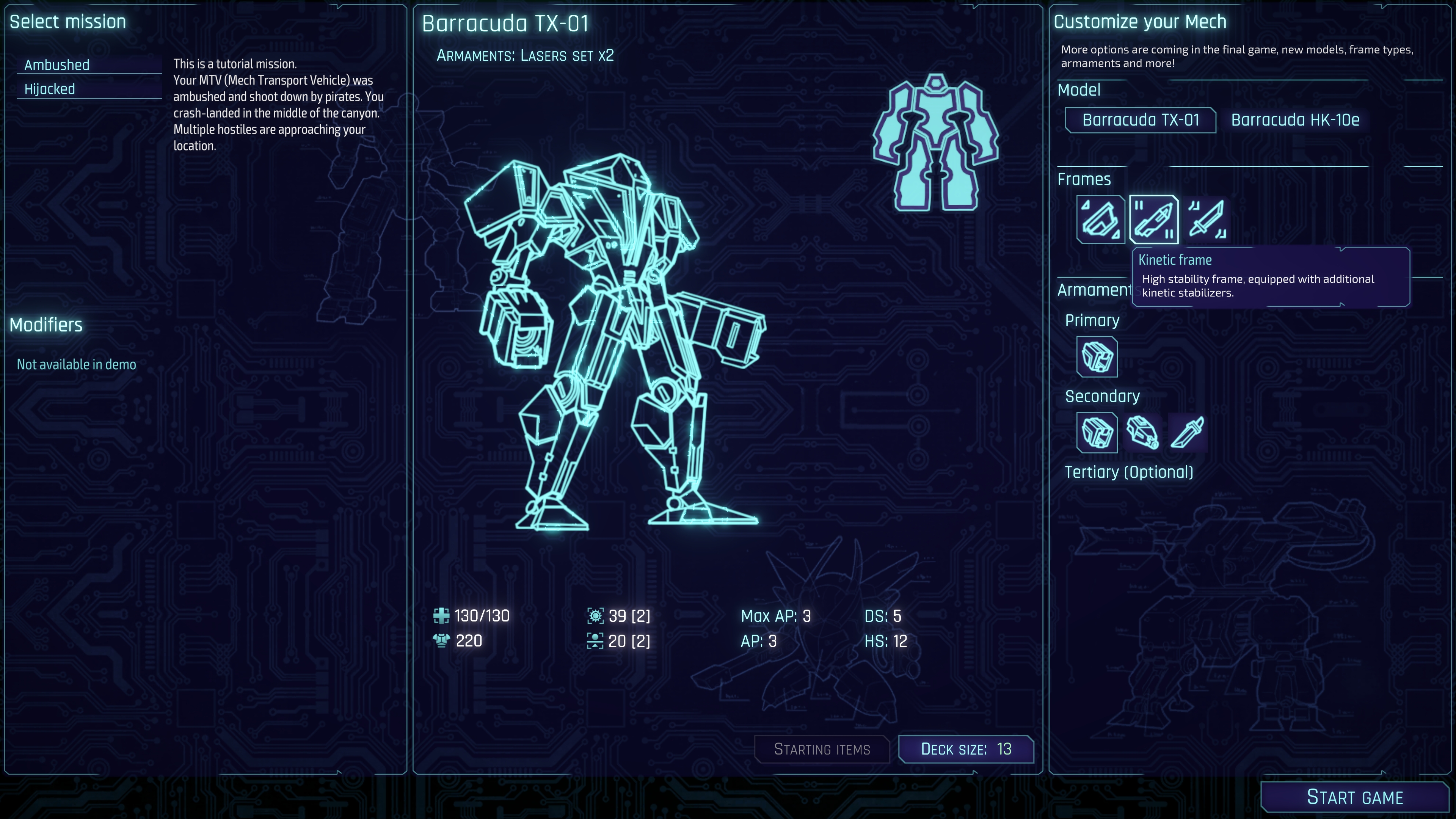 Choose your mech, customize your loadout, and build your perfect deck. Experiment with cards to find powerful combinations as you enjoy the tactical combat and deckbuilding in this roguelike adventure!