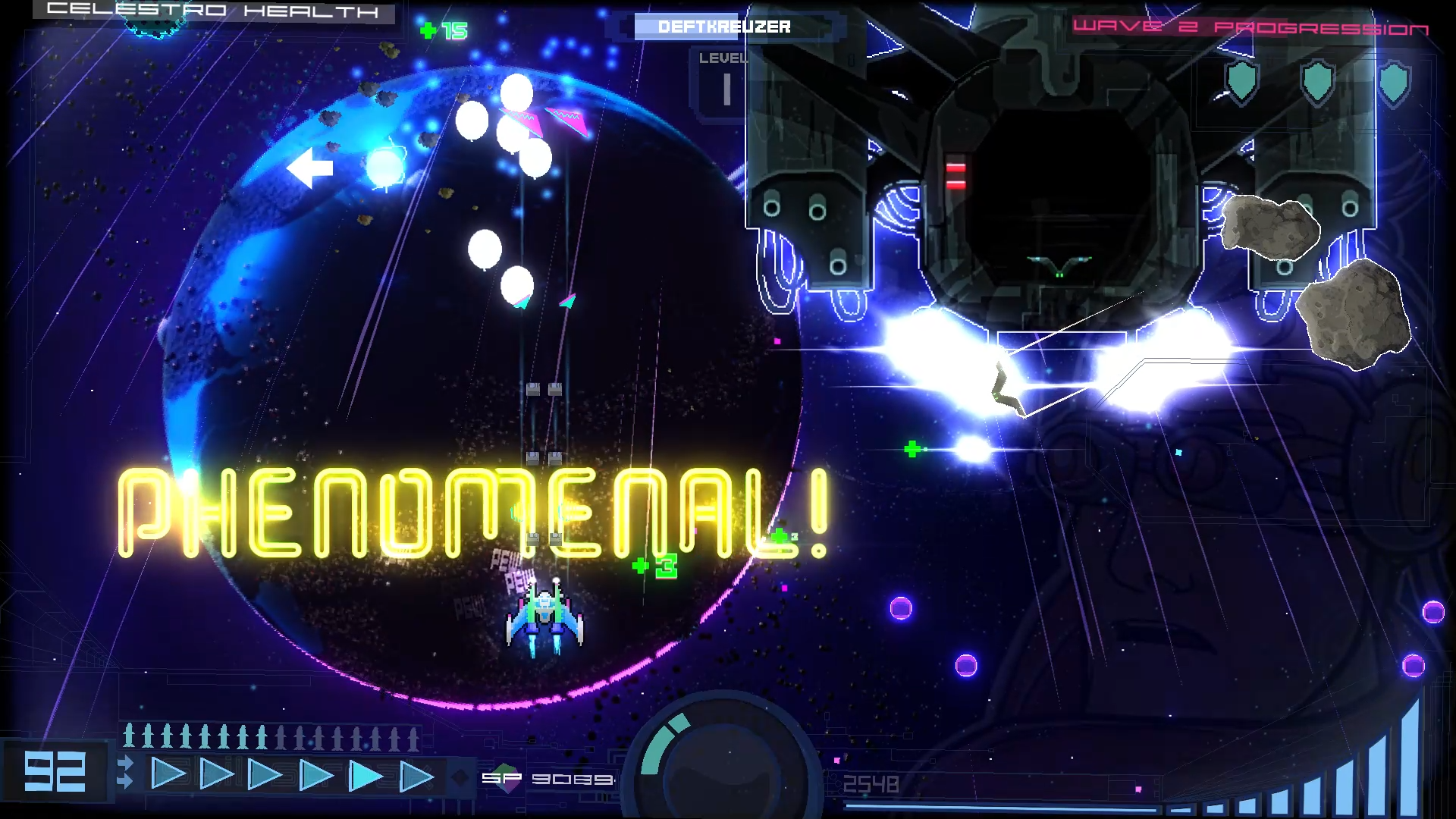 "A college football captain's fight to defend his rival's home-world from the rogue villain in his Professor's favorite arcade game. Slow time using Retro-Dash as you pilot Super G Machine through waves of scaling enemy's, defeat huge bosses, and explore Celestro with Captain Flerp and his copycat Nova!"