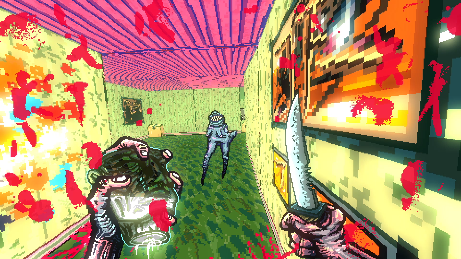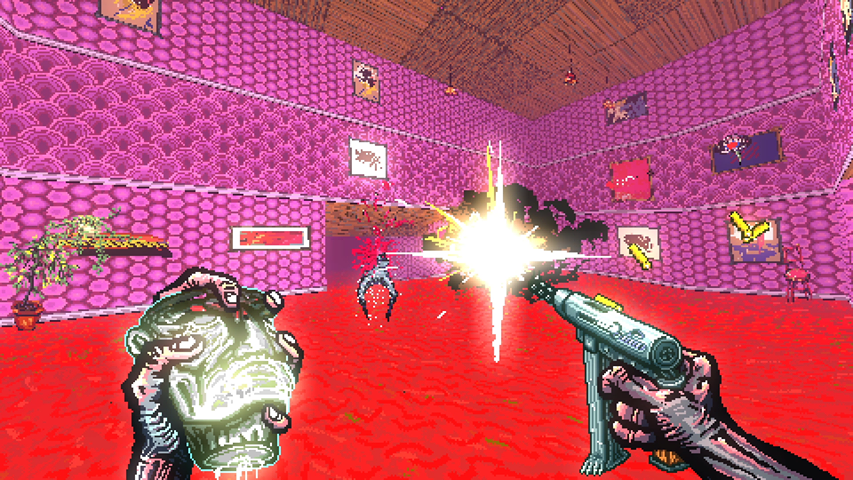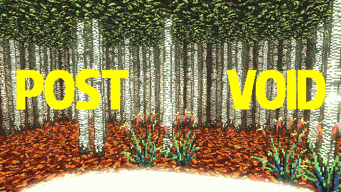 Post Void is a surreal headache, in a blinding haze of violence, where the goal of reaching the end is repeated again and again to impress yourself and your friends and to find the outside world a quietly bland but relaxing place. Until you look again, and see it's no void of quietness, but a vast noise that pushes you back into digital sprints, digital goals, and more unseemly violence. Time is always running out. Fiends are always in your way. Remove them in a shower of gore. Gain their liquid energy to fill your head and run on to the pond.